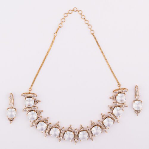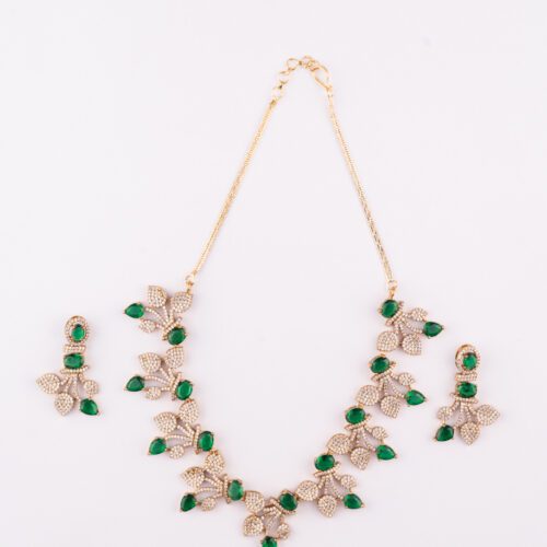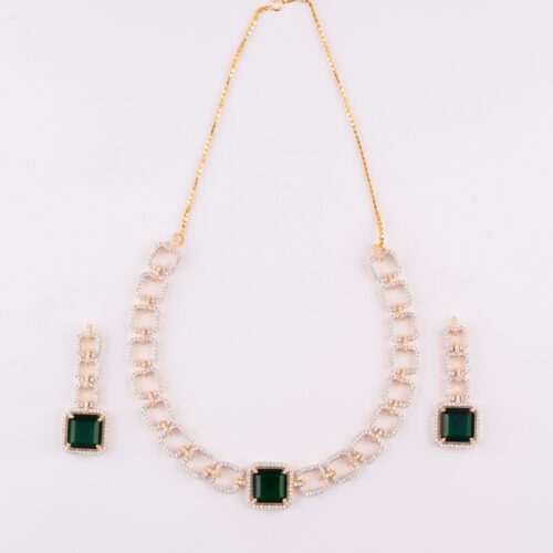 Green Square Crystal with AD on Square shaped Gold Necklace set