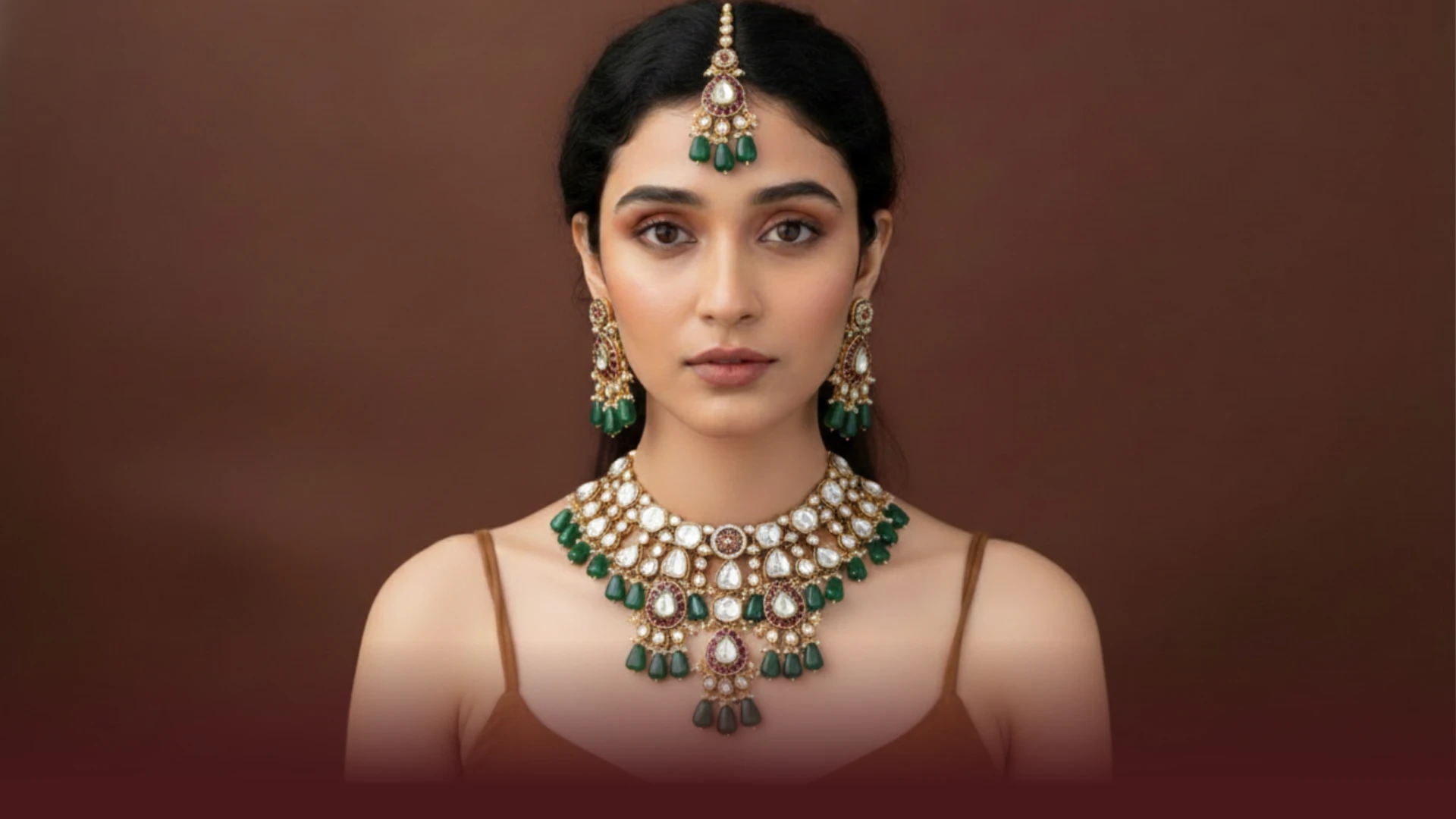 Pearls hanging on Kundan Set with Green outline on Gold polish