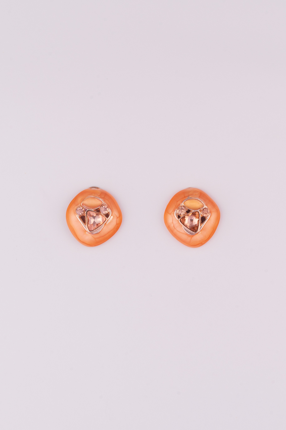 - Shape & Base: Each earring has a rounded, slightly organic square shape (cushion shape) and is coated in a glossy peach or coral-toned enamel.