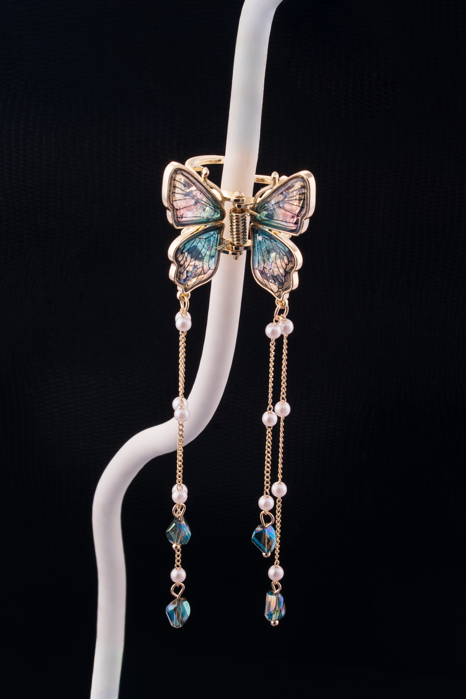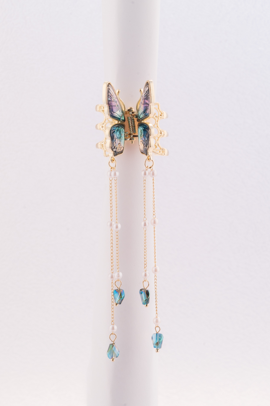 Elegant clutcher featuring a blue glass butterfly centerpiece