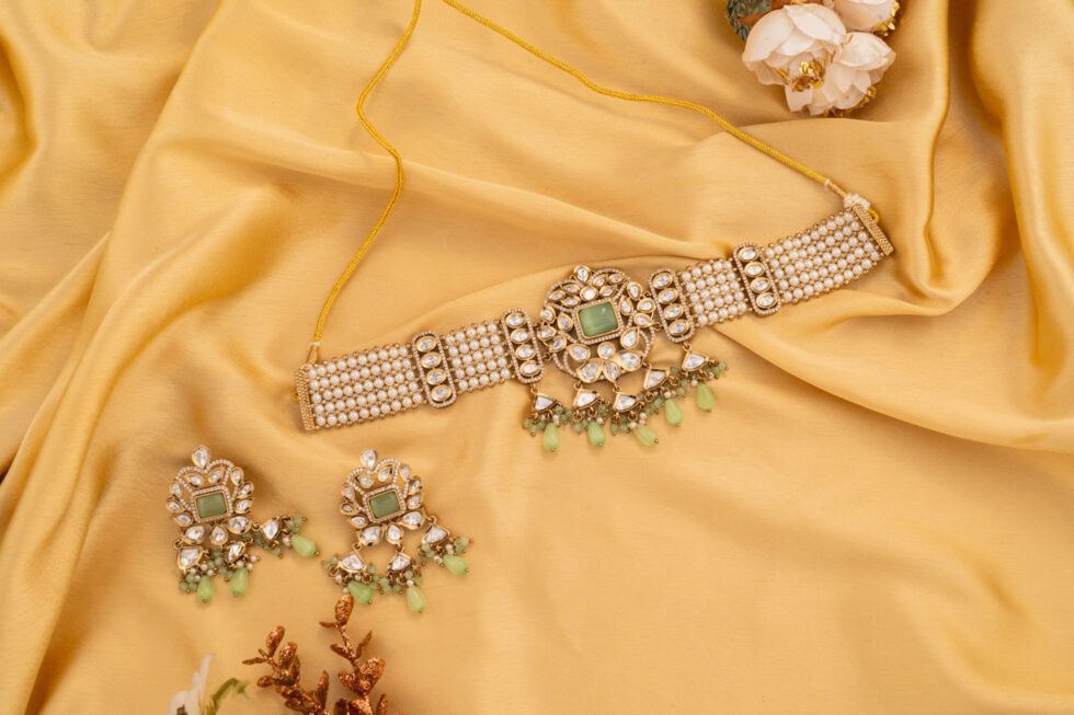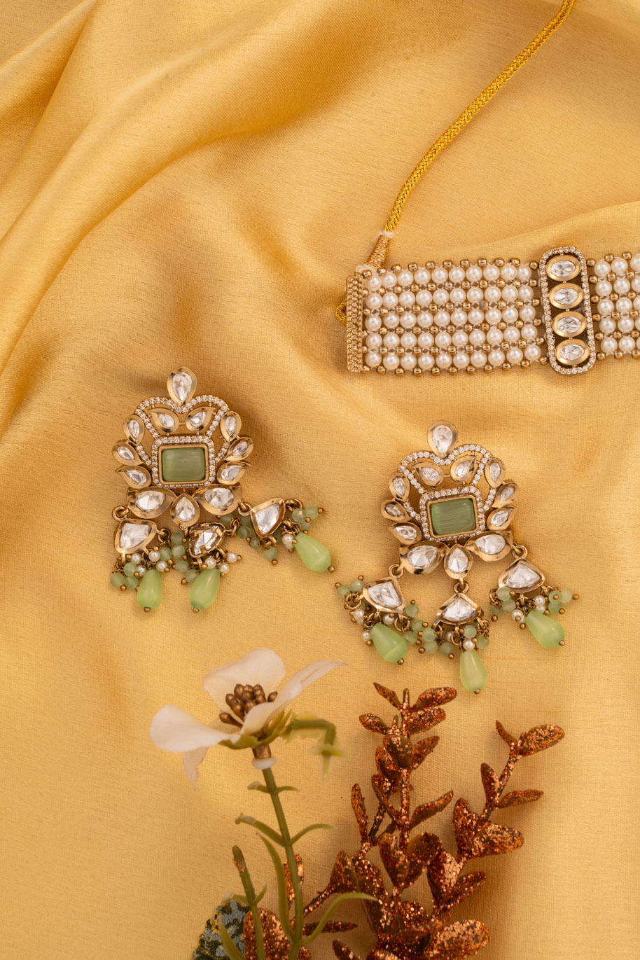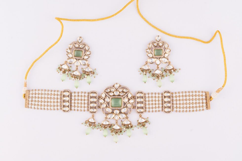 Chokr with Mint Green Stone Embellished with Pearls on Gold Base