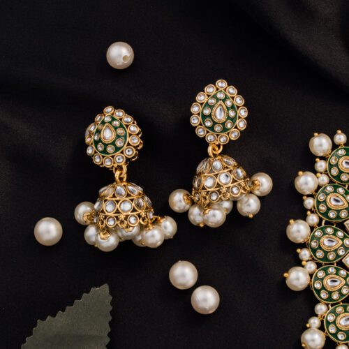 Pearls hanging on Kundan Set with Green outline on Gold polish