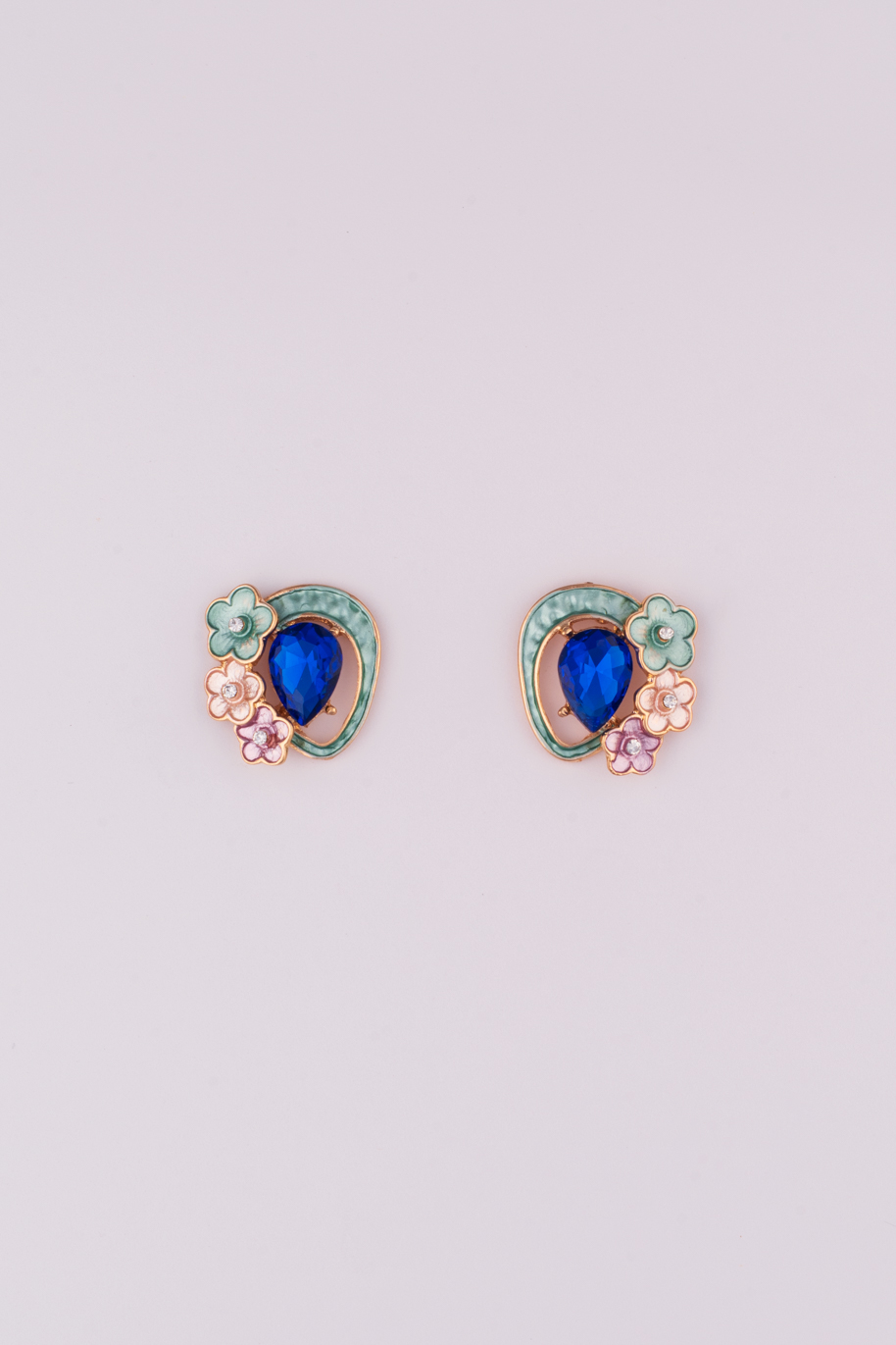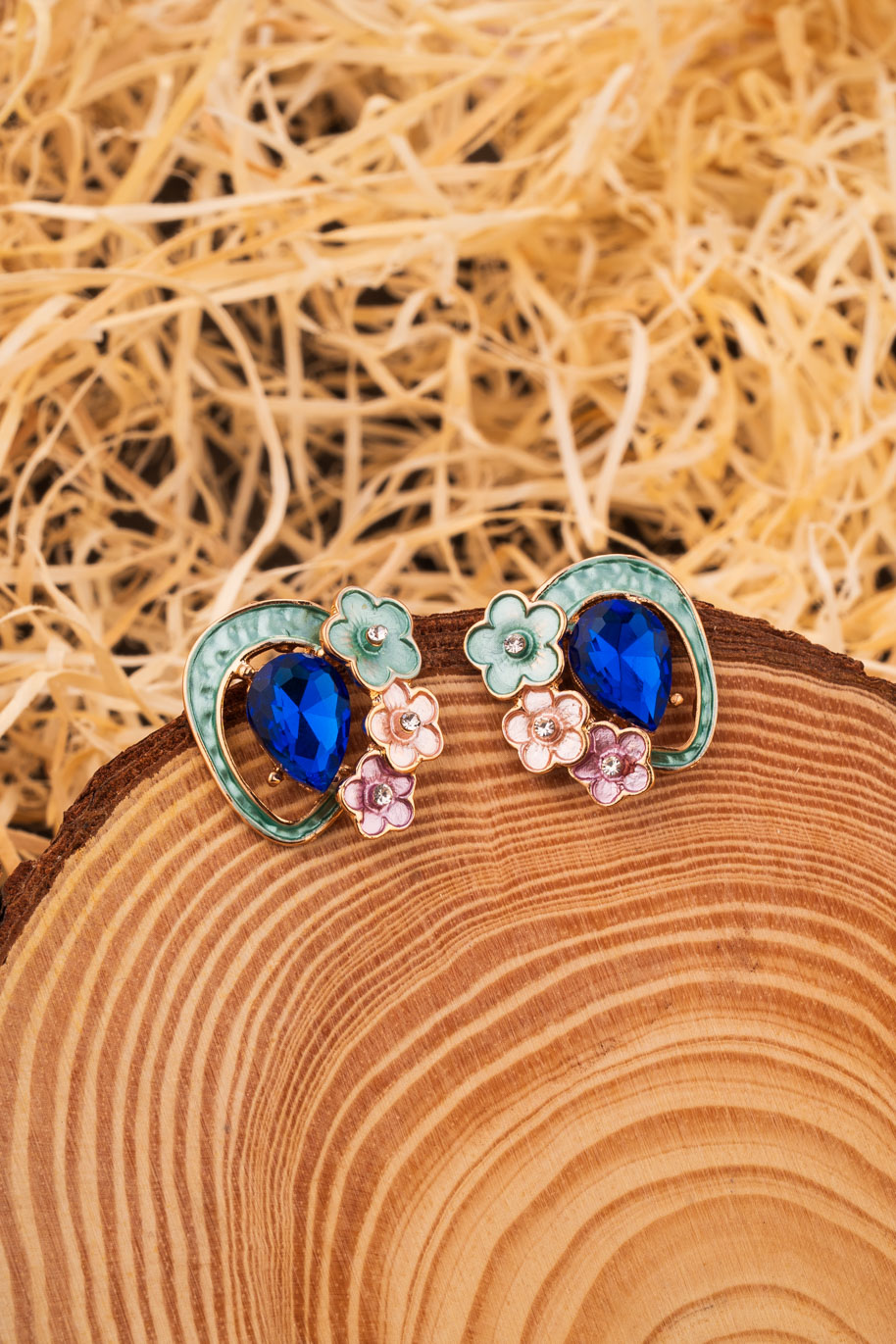 Add a touch of elegance and charm with these DARK BLUE Blossom Sparkle Earrings, designed to make every moment shine. Featuring a vibrant dark blue teardrop stone set in a soft rose-gold frame, these earrings are adorned with delicate enamel flowers and tiny crystals that capture light beautifully.