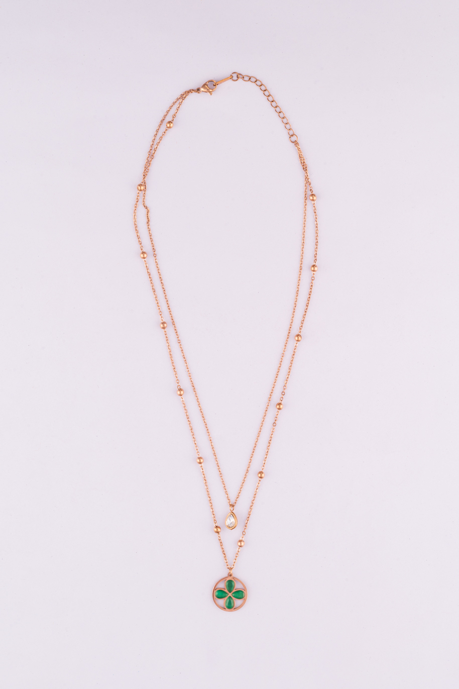Unique double-chain gold necklace with a stylish green-accented pendant