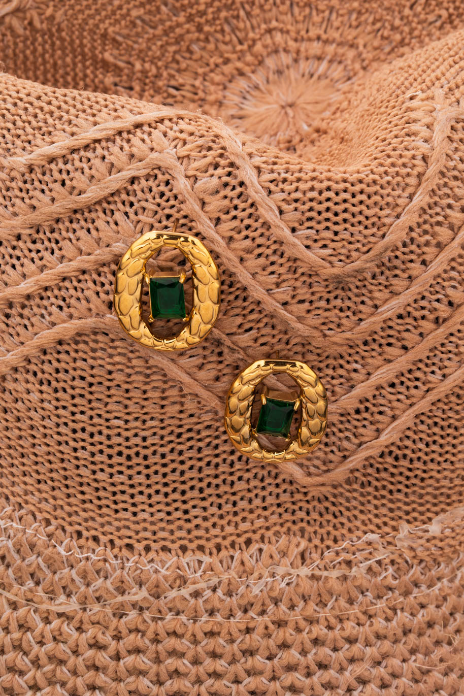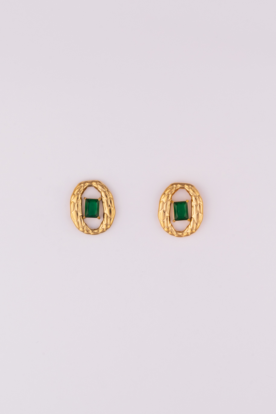 Radiate bold sophistication with our Emerald Aura Stud Earrings, where tradition meets modern allure. The rich green square-cut stone sits gracefully within a textured gold-toned oval frame, inspired by vintage artistry and regal charm.
