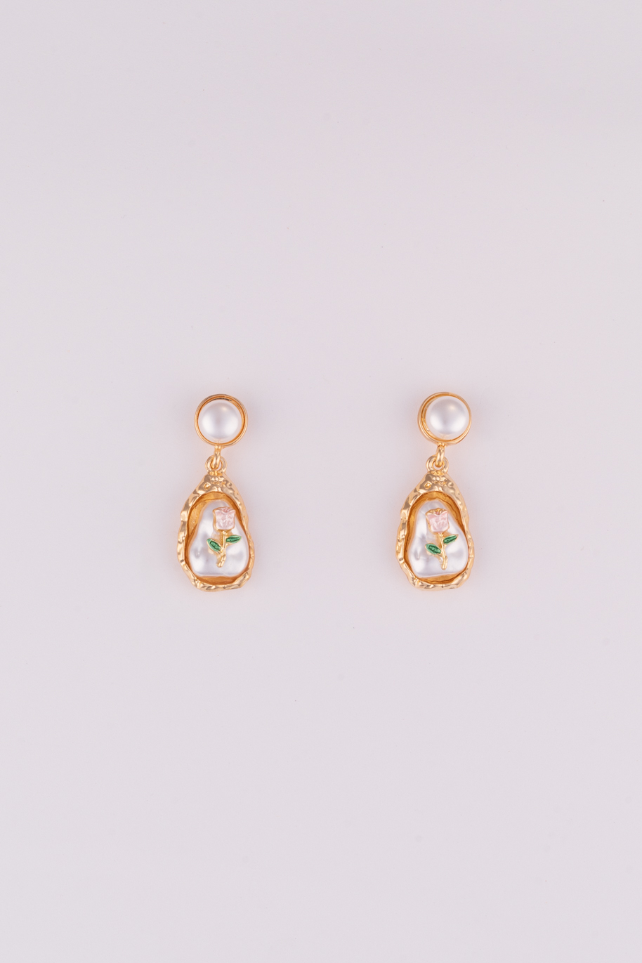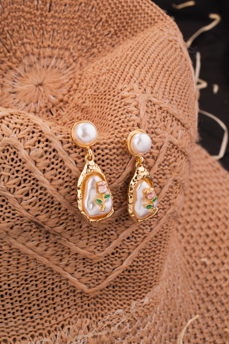 Each earring features a luminous round stud pearl, which connects to a stunning, organically shaped pendant. This pendant is framed in brilliant gold-tone metal and showcases a creamy, mother-of-pearl (or white enamel) canvas. Hand-painted or intricately set within this canvas is a delicate pink and green flower bud, offering a sweet, unexpected detail.
