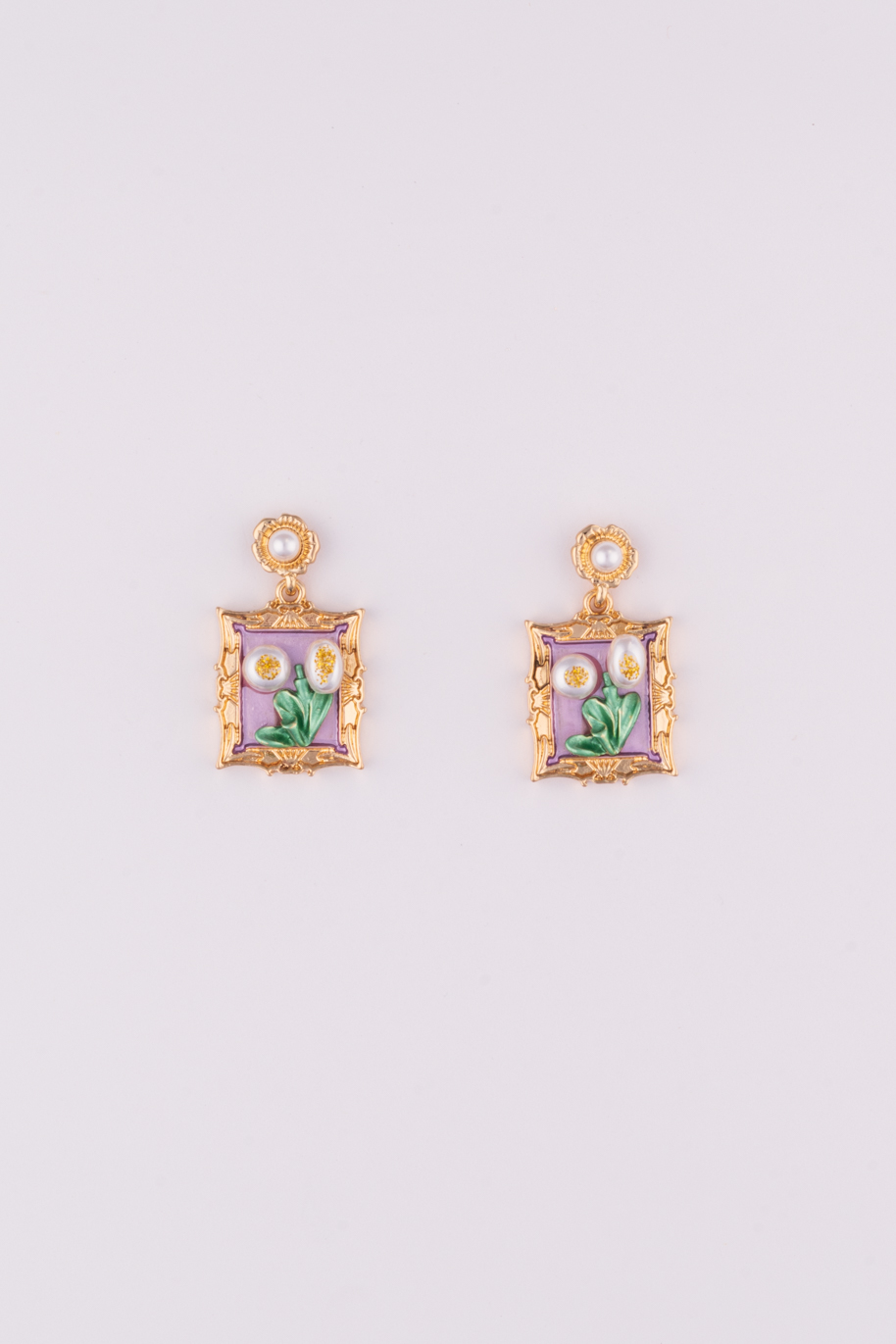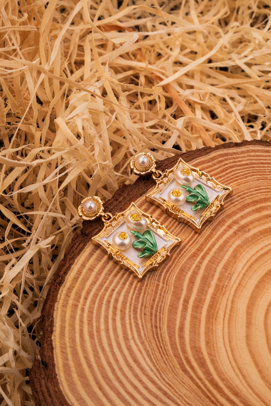 Add a touch of artistic grace to your look with these Floral Frame Pearl Earrings. Designed with a miniature frame-inspired silhouette, each earring features delicate green leaf motifs and lustrous pearls set against a glossy white enamel base. The gold-toned ornate edges enhance their regal charm, making them perfect for both festive and elegant everyday wear.