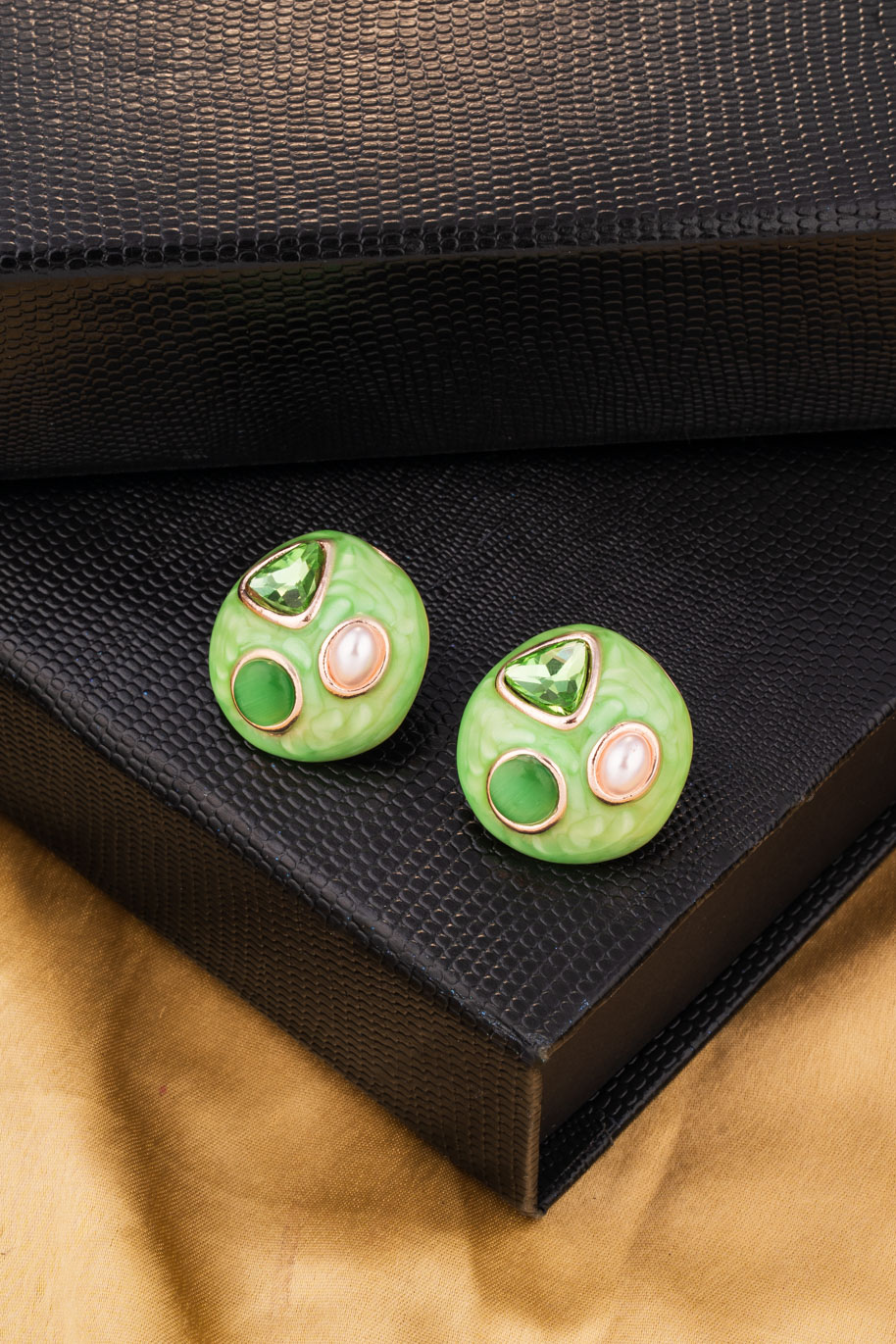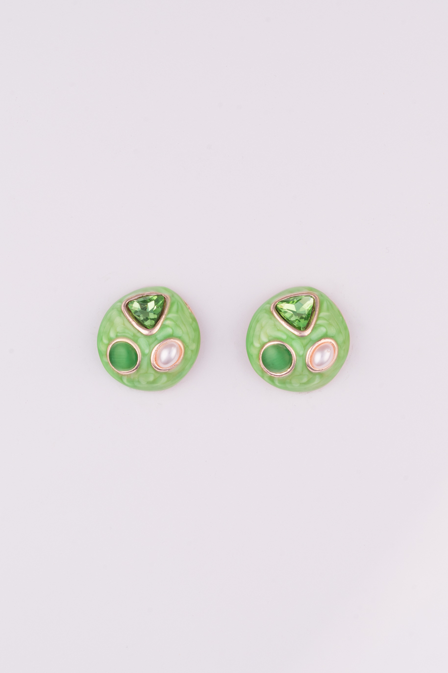- Base: Each earring has a rounded, organic shape and is entirely covered in a vibrant light green/lime green enamel with a subtle hammered or textured finish.