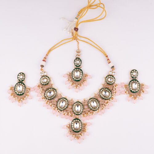 Green Pearls with Kundan set on Gold polish and Green Meena
