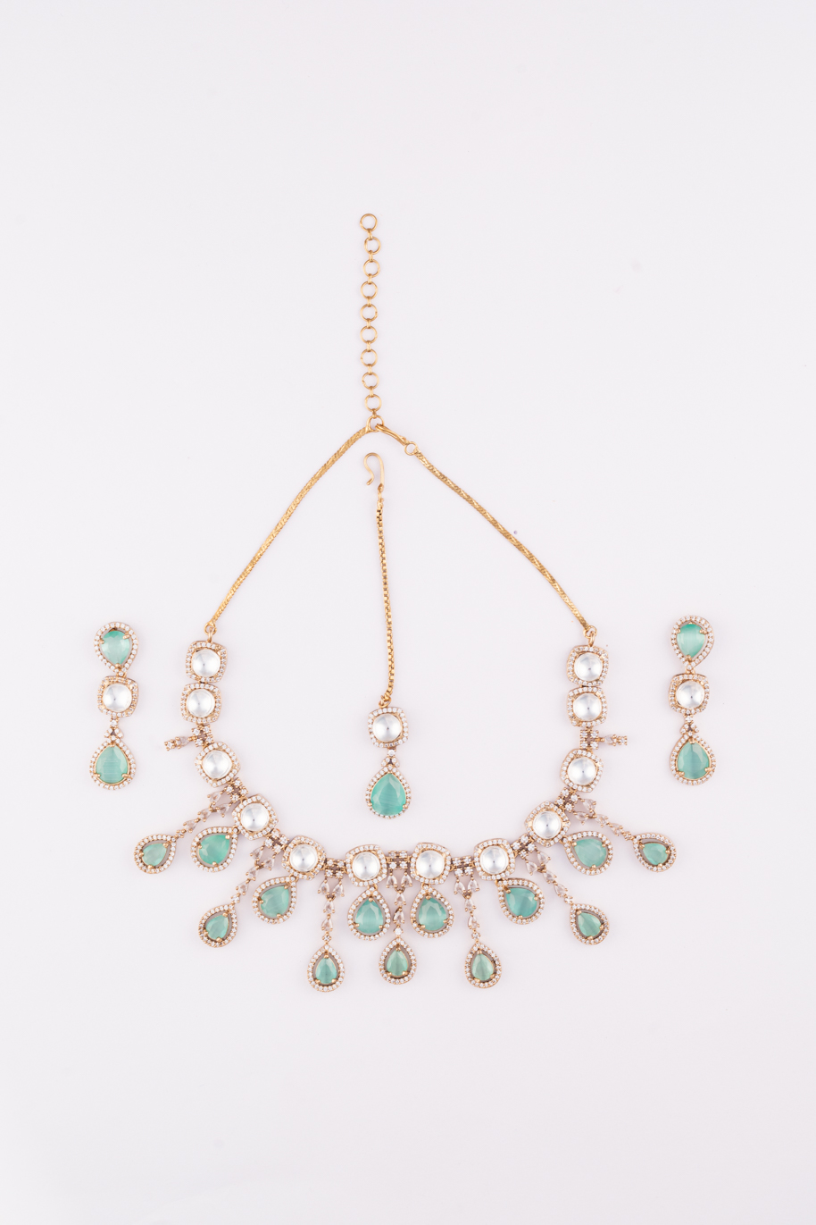 Green Square Crystal with AD on Square shaped Gold Necklace set