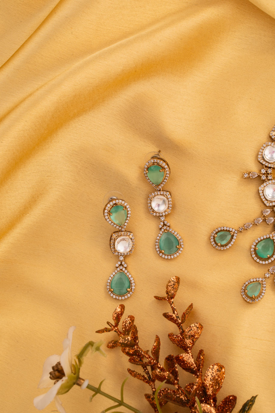 Hanging Aqua Blue Crystals On Gold Polish With perfectly crafted Kundan