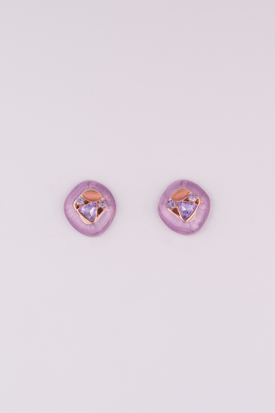 - Shape & Base: Each earring has a rounded, slightly organic square shape and is coated in a glossy lilac or lavender enamel with a subtle gold-tone trim.