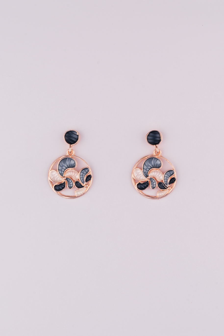 Inspired by the beauty of flowing patterns and soft contrasts, these Midnight Bloom Enamel Earrings bring elegance to life through artful design. The circular frame, bathed in a rose gold finish, holds intricate enamel detailing in shades of deep navy, grey, and pearl white — capturing the calm of night and the charm of floral motion. Lightweight yet statement-making, they’re perfect for adding a refined artistic touch to any outfit.