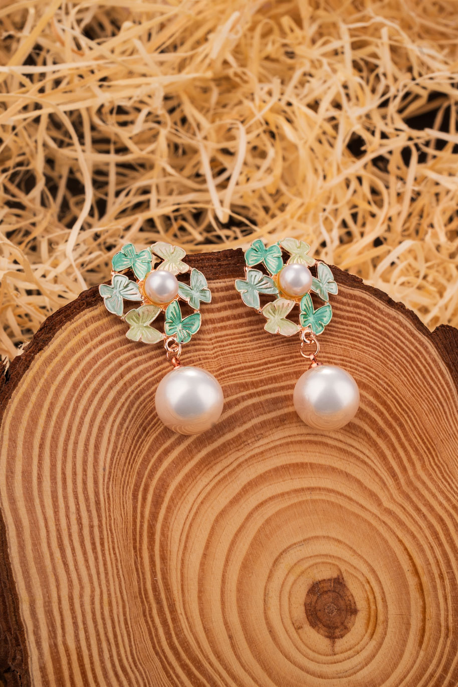 Discover the mesmerizing detail of these uniquely designed pearl drops. They capture the magic of a butterfly garden in a beautiful, wearable piece.