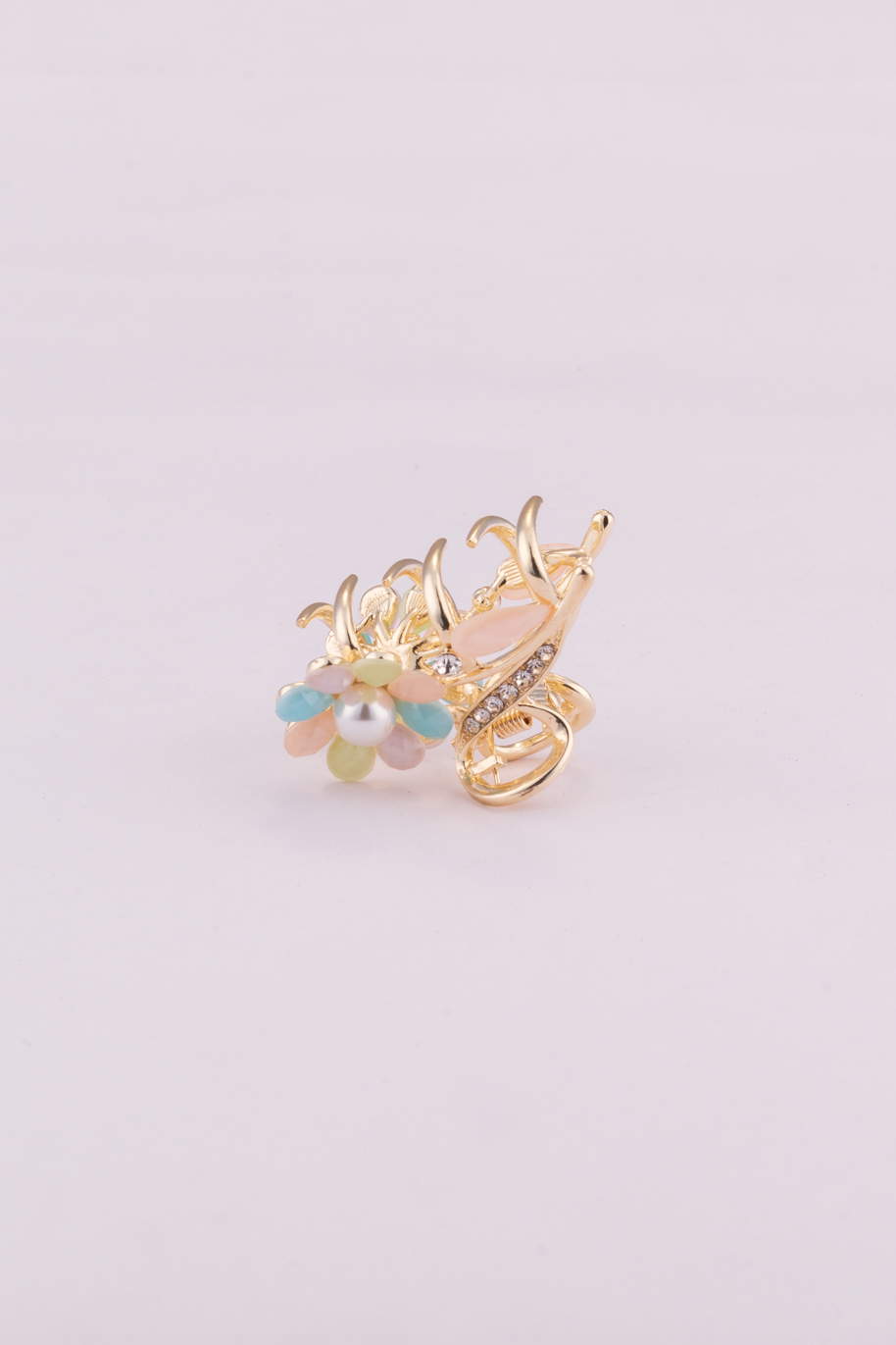 Stylish golden clutcher embellished with multi-colored pearls and floral accents
