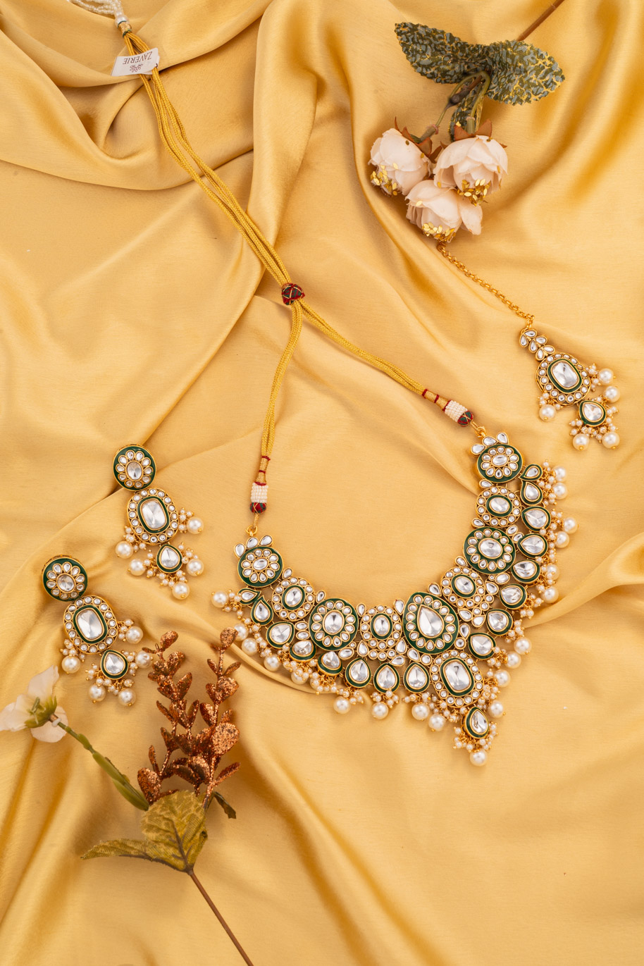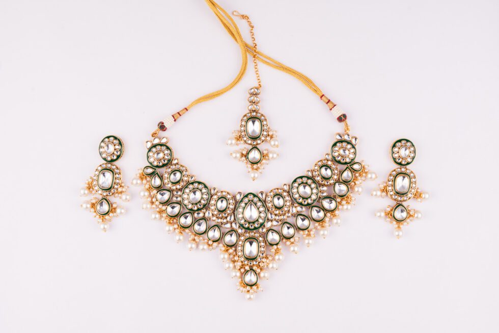 Be the first to review “Pearls hanging on Kundan Set with Green outline on Gold polish” Cancel reply