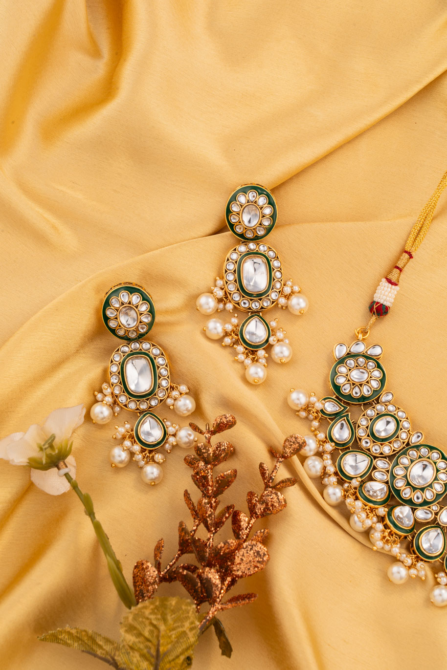 Pearls hanging on Kundan Set with Green outline on Gold polish
