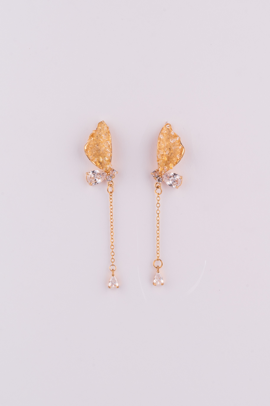 Each earring features a miniature butterfly wing finished in a radiant gold-tone. The wing shimmers with a beautiful texture of glittering gold-flecked resin, creating an ethereal look. Anchoring the design is a cluster of brilliant cubic zirconia stones that catch the light from every angle. A delicate gold-tone chain suspends below, finished with a subtle, sparkling teardrop stone for captivating, graceful movement.