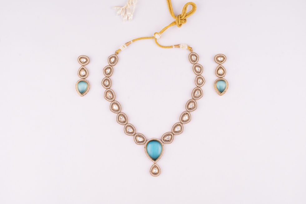 Be the first to review “Sky Blue Mosiannite Gem Embellish the Gold Kundan set gives an aesthetic look” Cancel reply