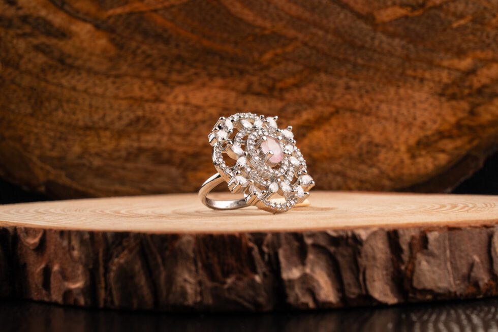 Elegant white gold ring adorned with sparkling rose pink AD stones