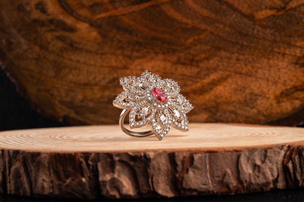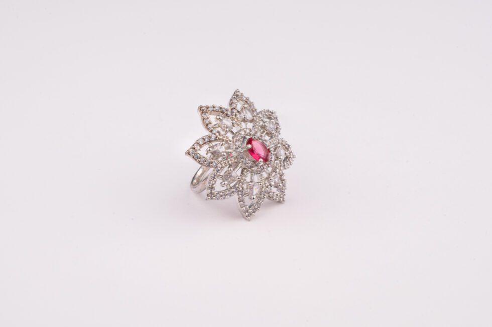 Star Flower White Gold AD ring with Wine Stone Embellished