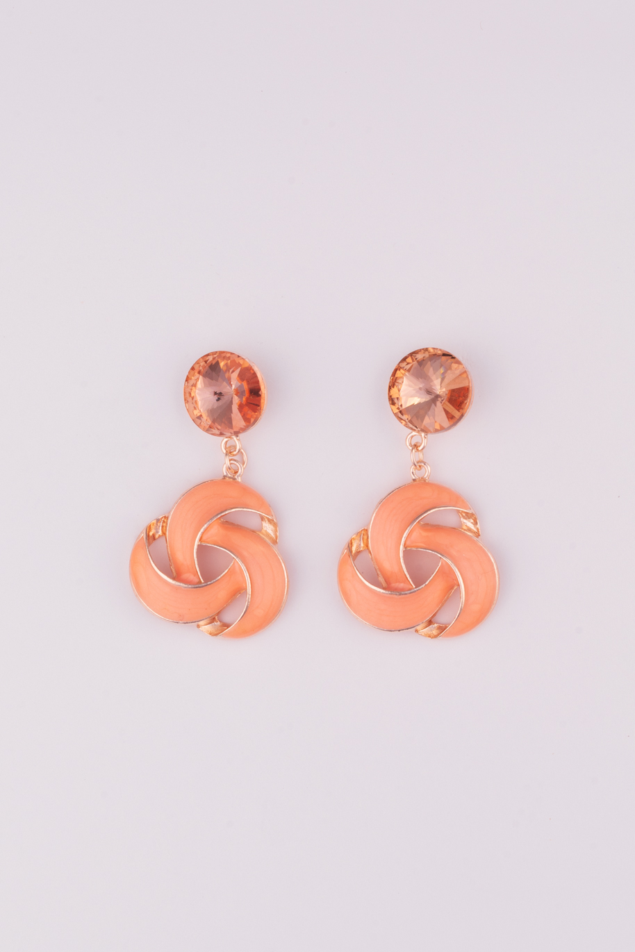 The design begins with a luminous, multi-faceted peach-toned gemstone serving as the stud, delivering brilliant sparkle right at the earlobe. This connects to a dimensional, interwoven drop featuring smooth, rosy-orange enamel. The knot motif symbolizes connection and continuous movement, giving the piece a deeper, artistic meaning.