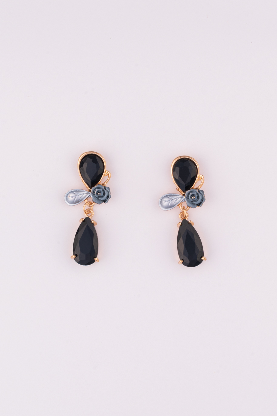 Each earring features two stunning, faceted black teardrop gems set in a bright gold-tone bezel, creating a sleek vertical line that lengthens the neck. The standout feature is the beautifully detailed blue enamel rose and leaf motif nestled between the stones. The subtle pale blue and slate tones of the flower cluster provide a cool, refined contrast to the deep black stones and warm gold metal.