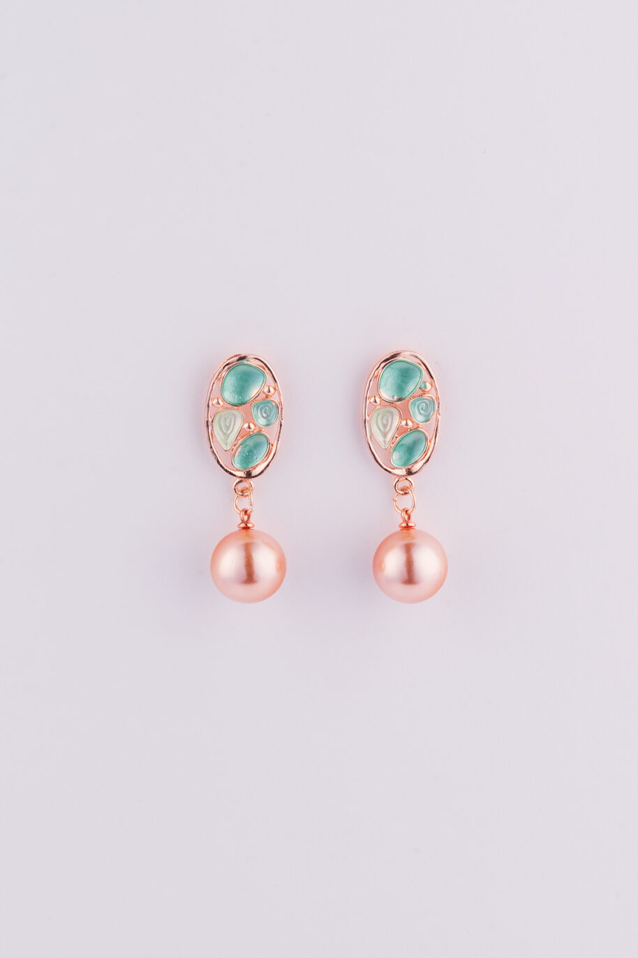 The oval stud features a luxurious rose gold-tone frame, housing a modern mosaic of glossy mint and seafoam green enamel or stone segments. This cool, refreshing hue is beautifully contrasted by the luminous, rich peach pearl dangling below.