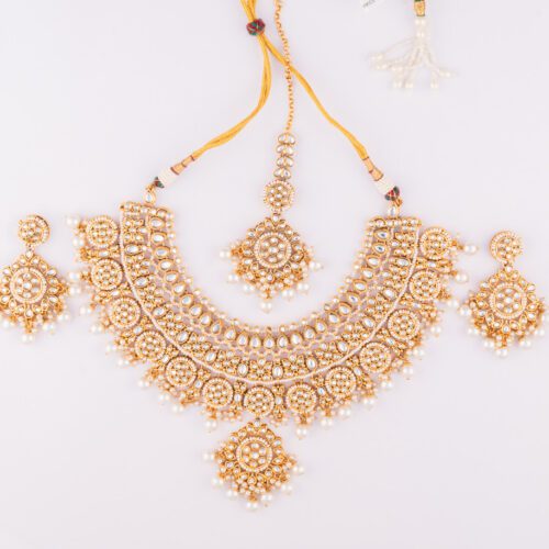 Pearls hanging on Kundan Set with Green outline on Gold polish